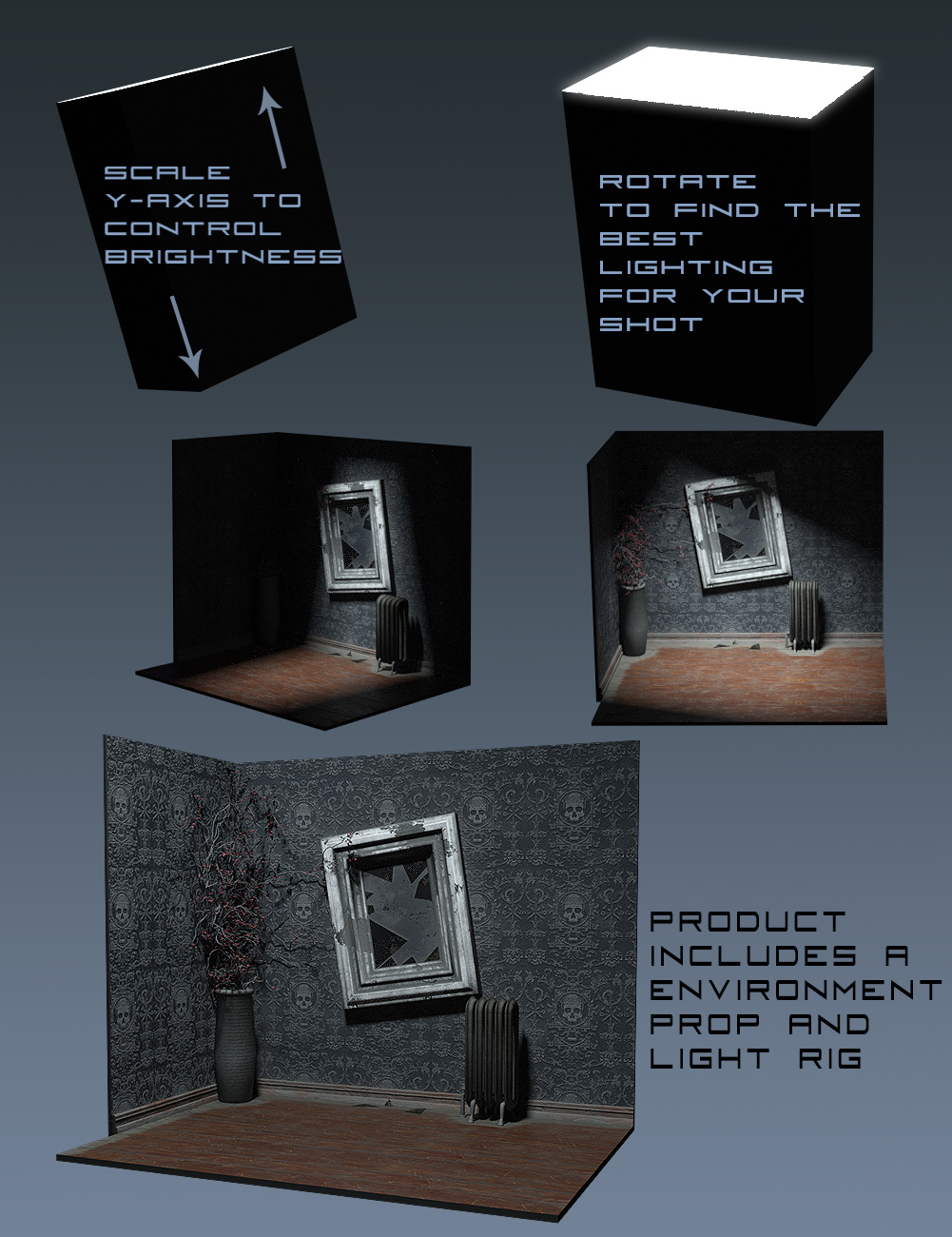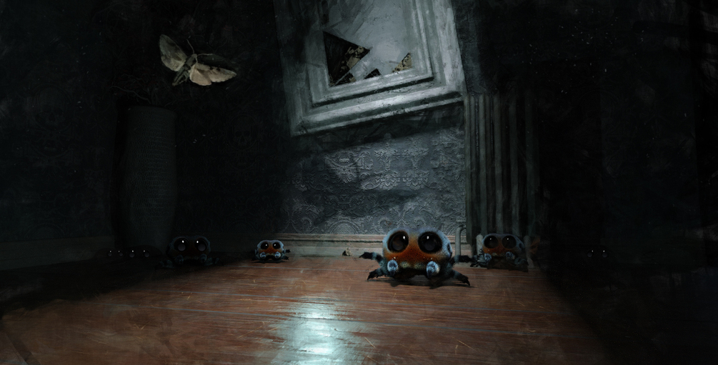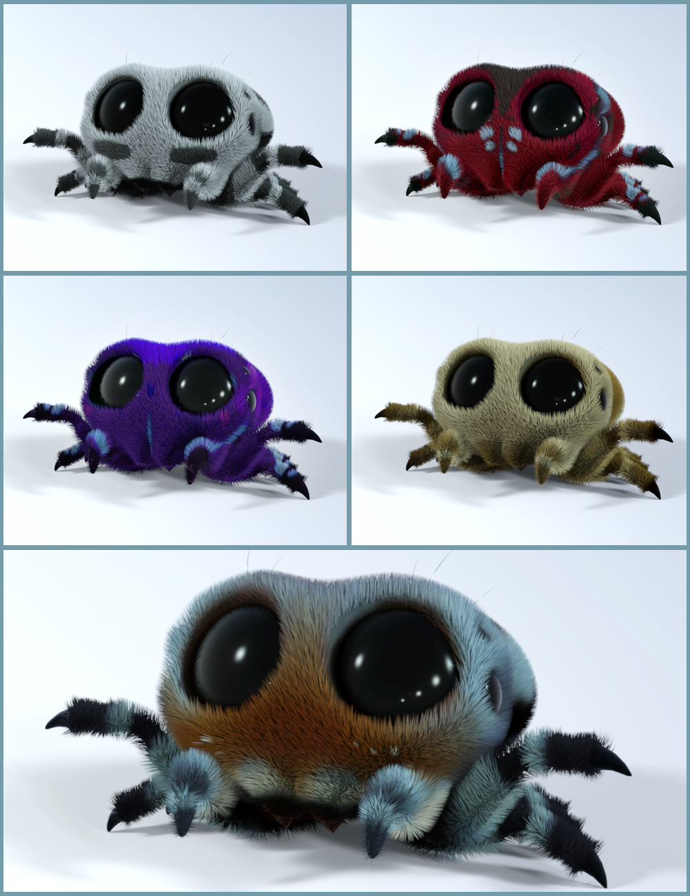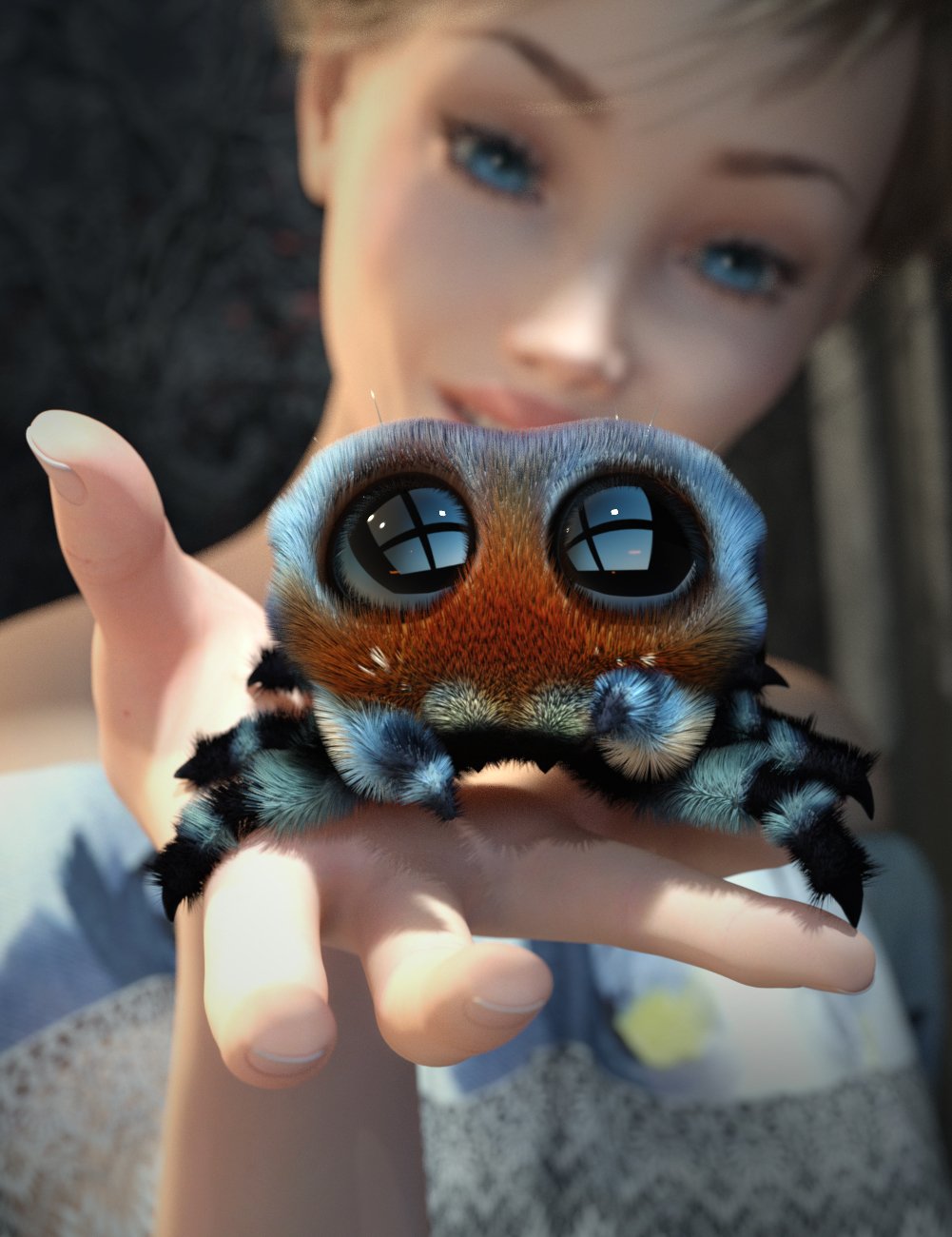Fully rigged jumping spider for use in Daz Studio 4.11 and higher, with dForce hair. 5 Color presets, 5 Pose presets plus default, 5 Eye adjustments, 3 body morphs and his own mini house set with light rig.